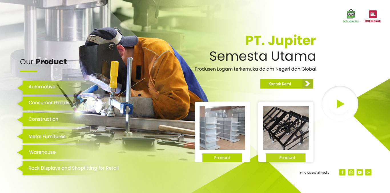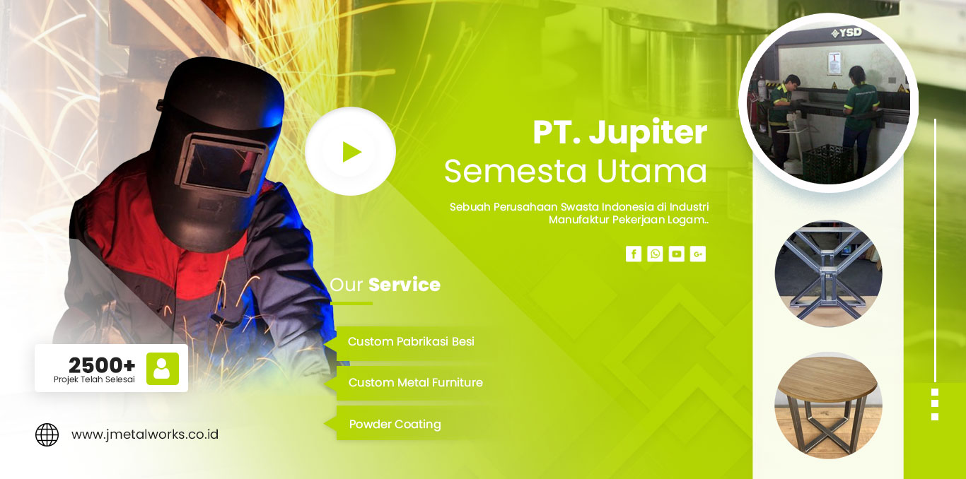 PT. Jupiter Semesta Utama telah berdiri sejak tahun 1992. Sebuah Perusahaan Swasta Indonesia yang bergerak di Industri Pekerjaan Pabrikasi Besi. Produk kami sebagian besar adalah Furniture Besi, Rak Display, Rak Retail (Shop Fitting dan Warehouse Fitting) lalu Custom Made Barang Besi lainnya. jmetalworks berkomitmen untuk menyediakan solusi pekerjaan pabrikasi besi berkualitas tinggi kepada pelanggan di seluruh Indonesia.
